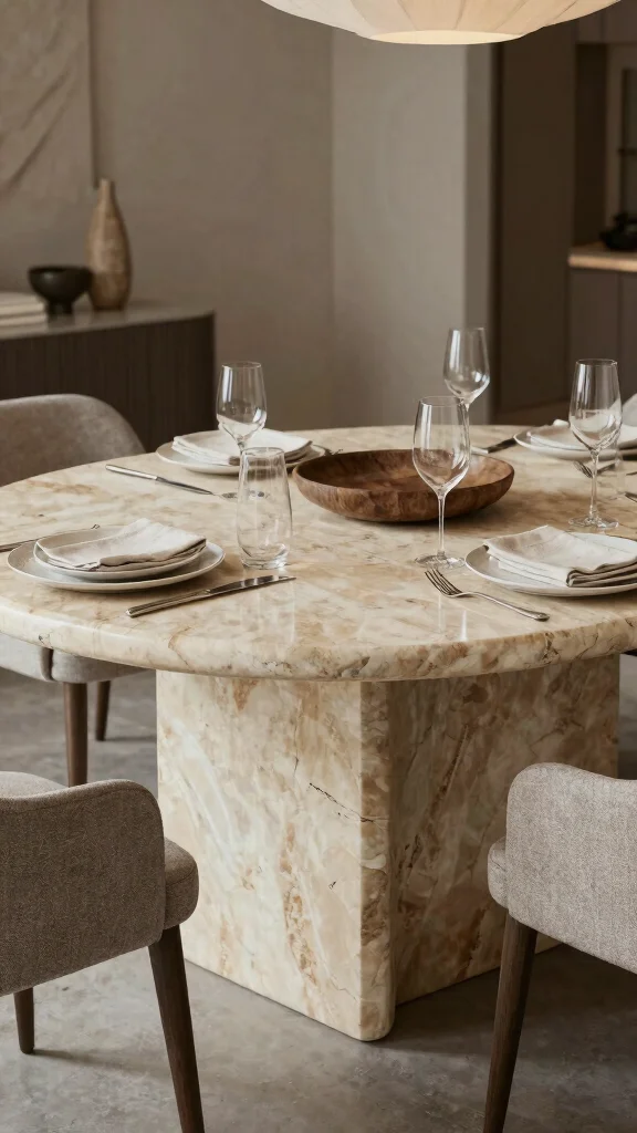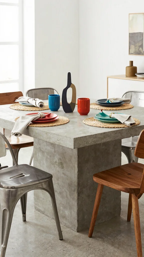 Concrete may seem industrial, yet it introduces a chic, edgy vibe to your dining room. This durable material can be molded into various shapes, offering a versatile option for unique dining table designs. Pairing a concrete table with wood or metal chairs creates a striking juxtaposition. The rough texture of concrete beautifully contrasts with soft, organic table settings, like woven placemats or linen napkins.