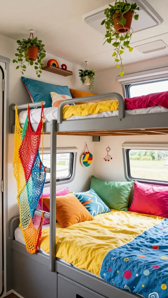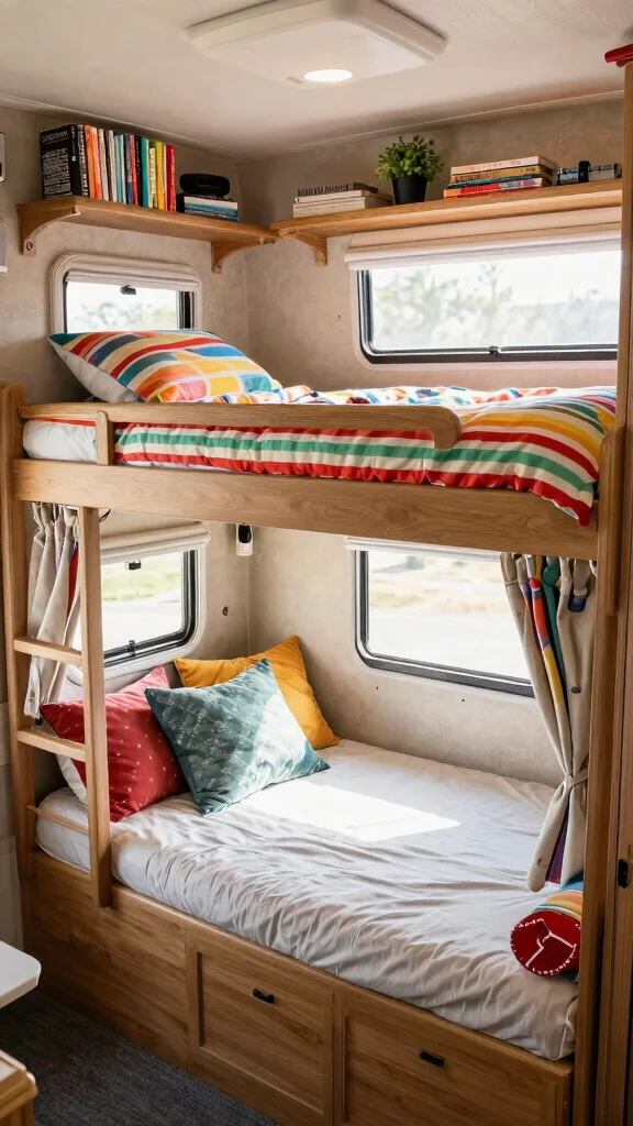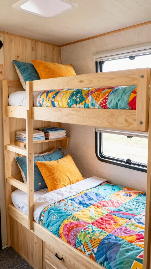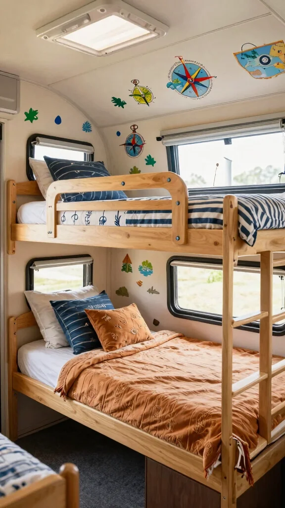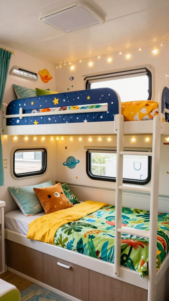 Fun fact: themed bunk beds can reclaim up to 20% more usable sleep space in a tiny RV thanks to smart vertical layouts. With diy camper bunk beds, mix bold colors, theme bedding, and decals—turn naps into portable adventures. Pro tip: add wall art that matches the theme.