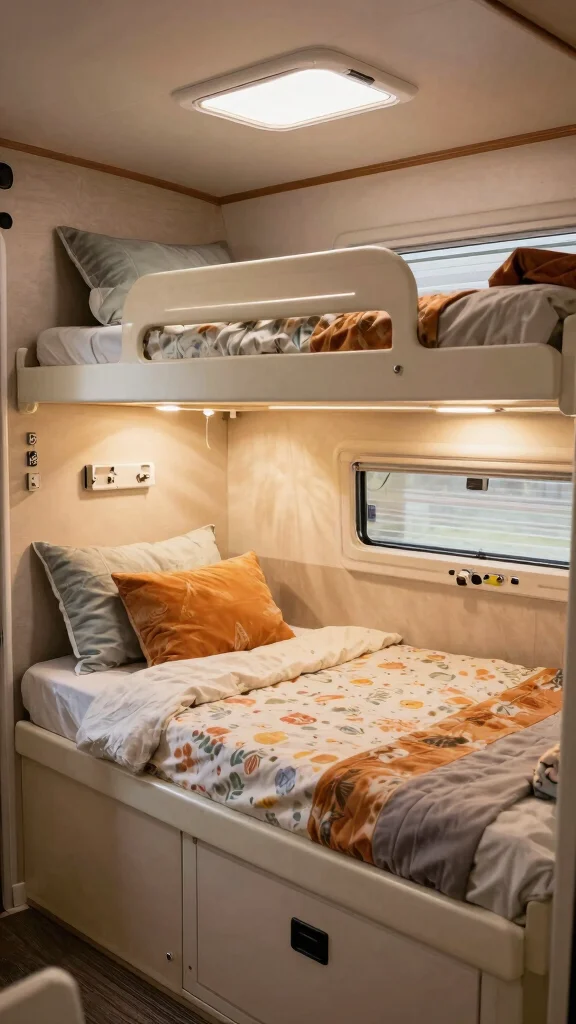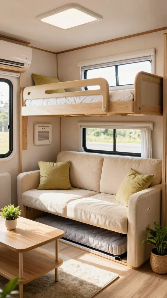 For maximum adaptability, consider a multi-use sofa bunk bed design. This clever setup allows the bed to fold down from a comfortable sofa, providing both seating and sleeping options in one compact solution. It’s perfect for smaller RVs, combining comfort with space-saving efficiency.