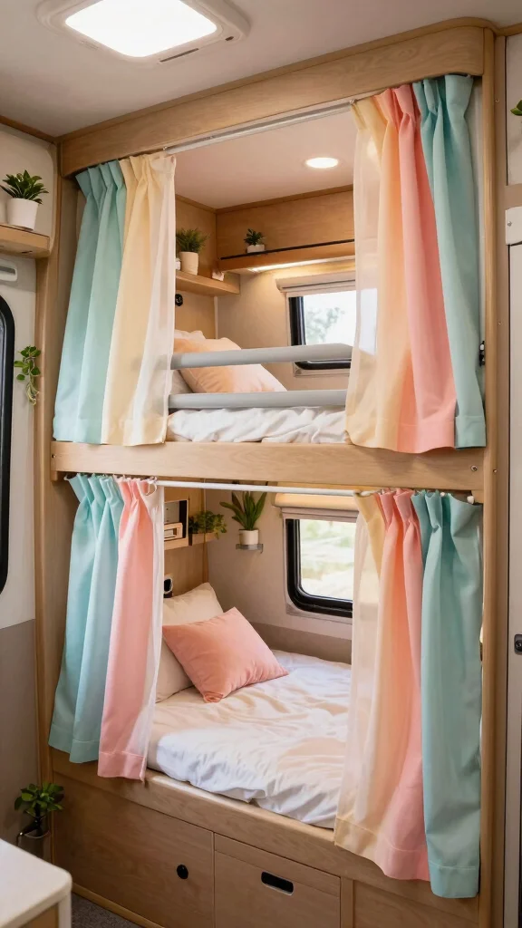 Elevate your sleeping quarters with bunk beds that include privacy curtains. This simple addition can transform each sleeping area into a cozy retreat, offering a sense of personal space for everyone. You can easily sew or purchase curtains that match your decor, allowing for quick adjustments based on preference.