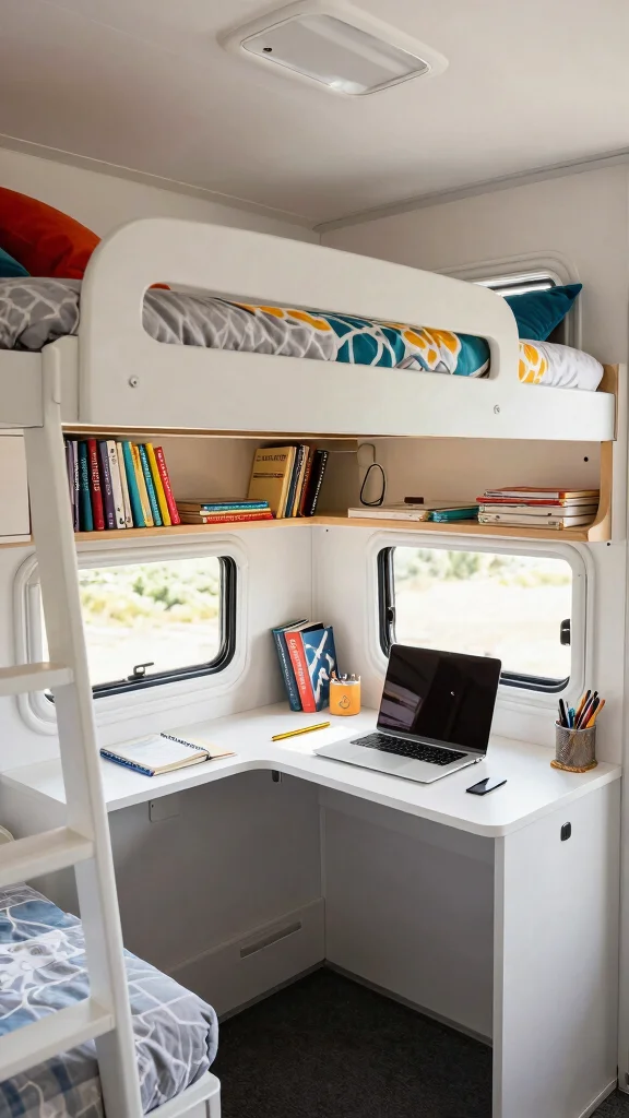 Merge practicality with creativity by designing bunk beds that feature integrated desks. This idea caters to those in need of a workspace on the road, ensuring that every square inch of your RV is utilized effectively. The desk can be part of the lower bunk or designed as a fold-out unit beside it.