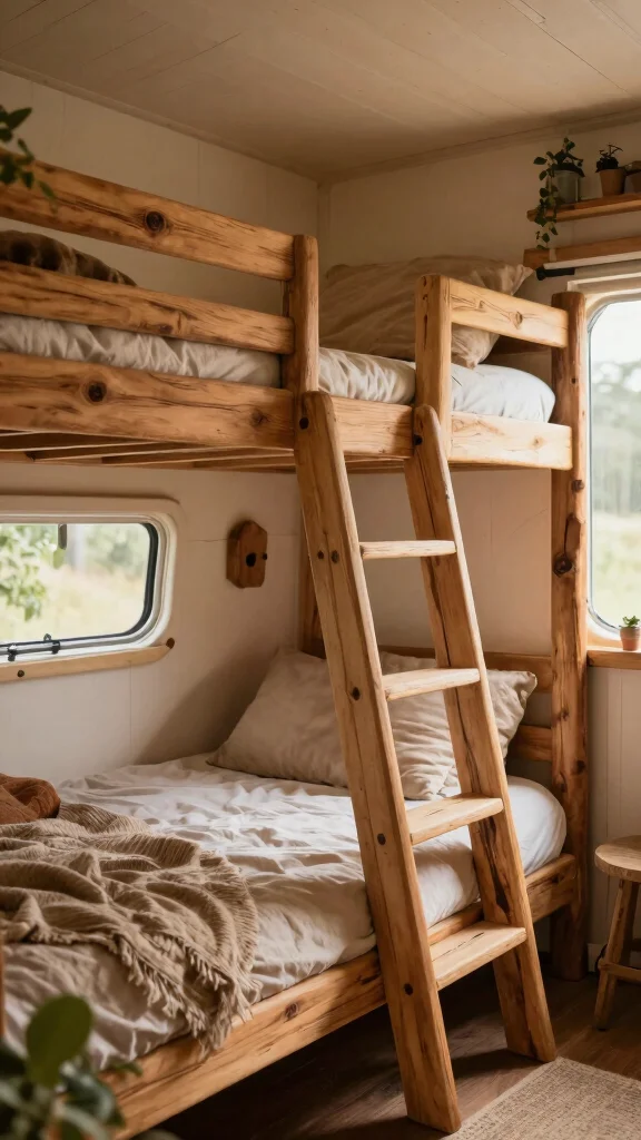For those who appreciate a natural aesthetic, rustic wooden bunk beds can infuse warmth and charm into your RV. Utilizing reclaimed wood adds a unique character to your space, with the wood’s natural grain beautifully showcased through simple stains or oils.
