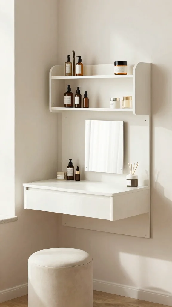 A floating vanity table is a brilliant choice for maximizing a small space while maintaining style. This design principle creates an airy feel, allowing the floor area to appear larger, making your room feel more open and inviting. By choosing materials like sleek wood or glossy finishes, and pairing it with a large mirror, you create a chic focal point in your decor.