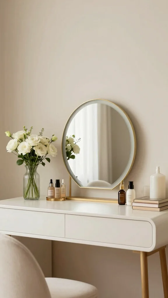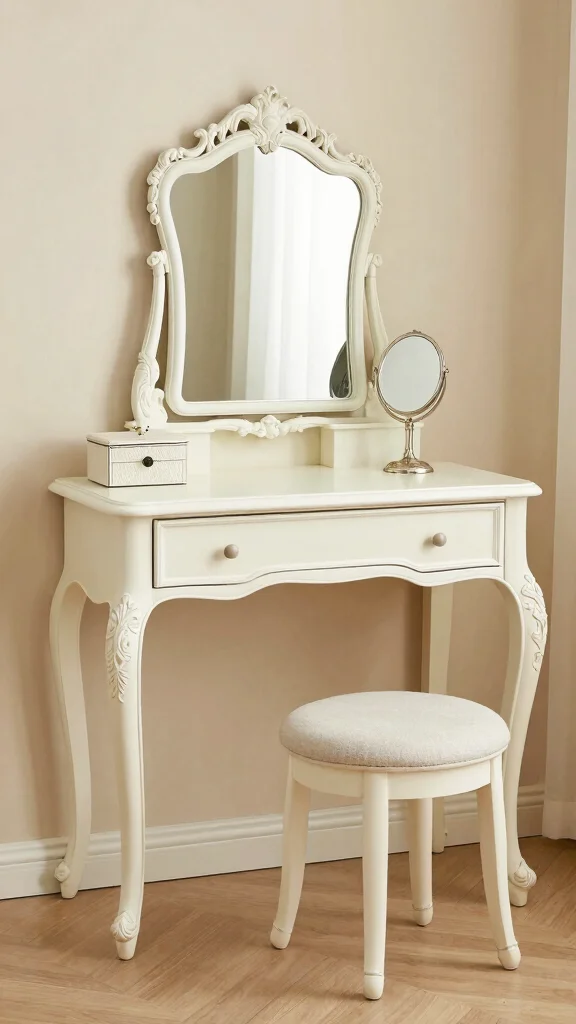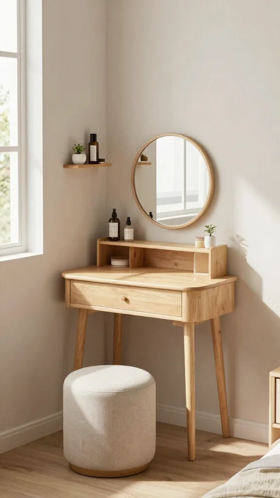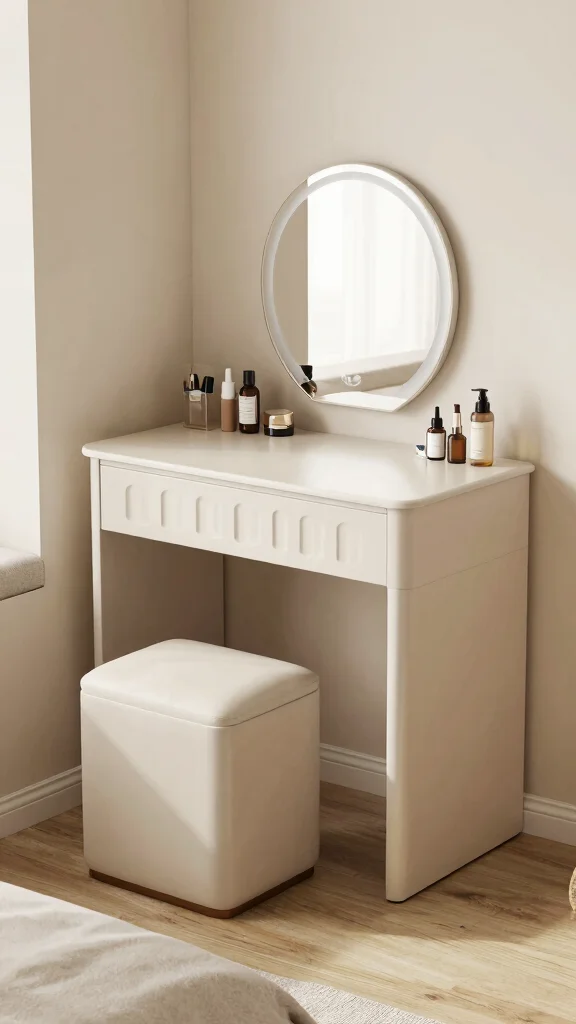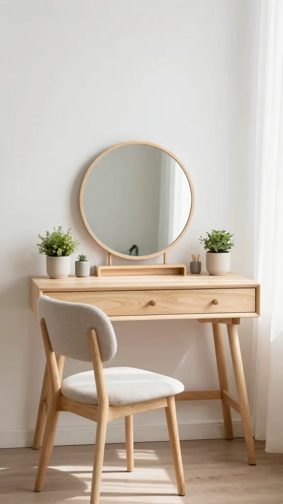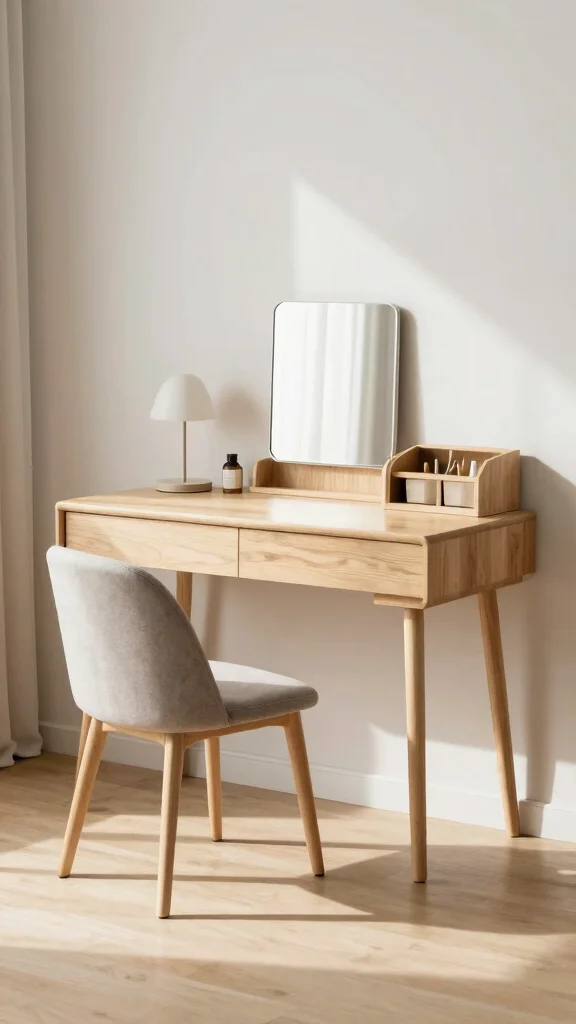 A minimalist desk vanity blends the practicality of a dressing table with the clean lines of modern design. This style is perfect for those who appreciate simplicity and want a clutter-free space. Choosing a sleek table in light wood or bright hues can keep the atmosphere fresh and inviting.