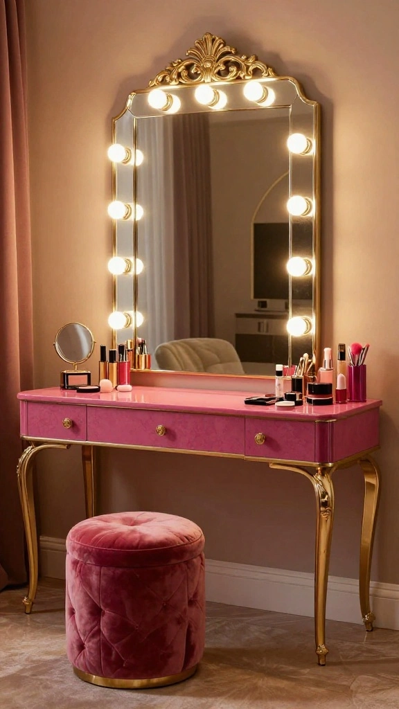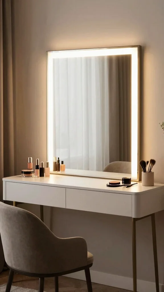 Adjustable lighting can enhance your experience, while mirrors with lights add a modern touch. Soft white bulbs create a flattering glow, making your makeup routine feel luxurious and well-lit.