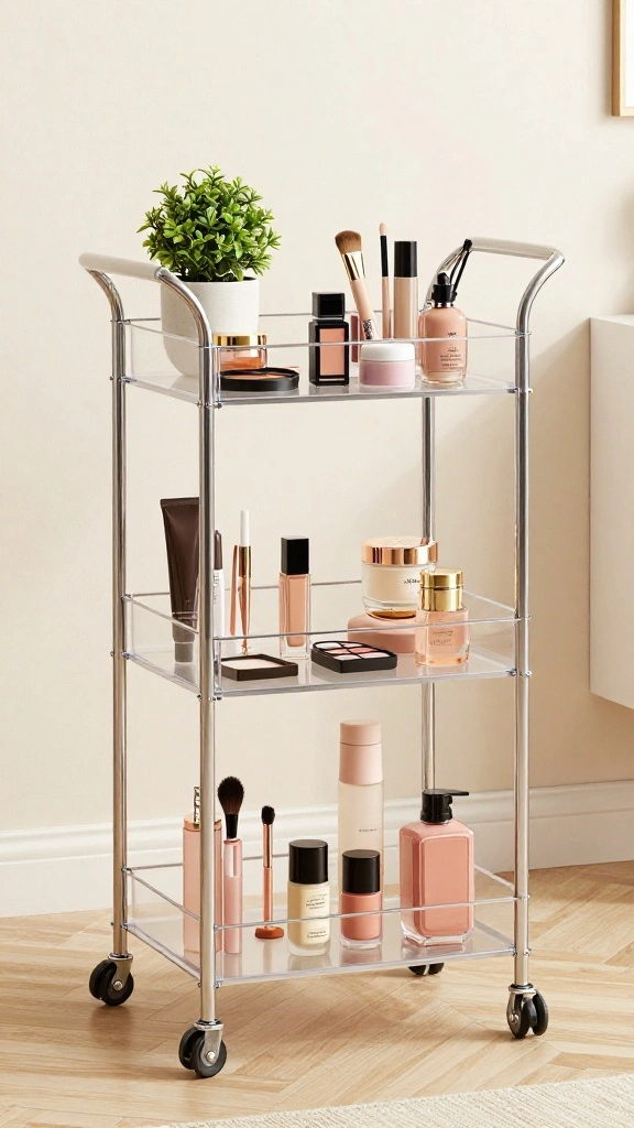 Using clear containers can keep products visible and accessible, while adding decorative elements like small succulents enhances the aesthetic. Consider a cart with wheels for added mobility, making your routine even more convenient.