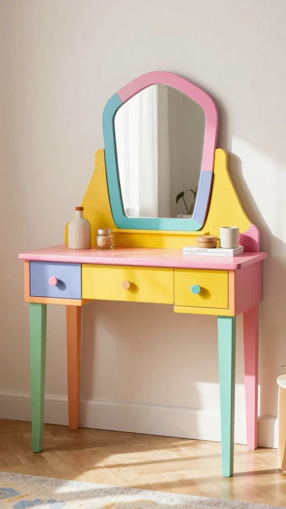 Pairing it with neutral accessories will allow the table to stand out, while a uniquely shaped mirror can enhance the playful theme. Choosing decor items that resonate with the vibrant colors will further enrich the space.