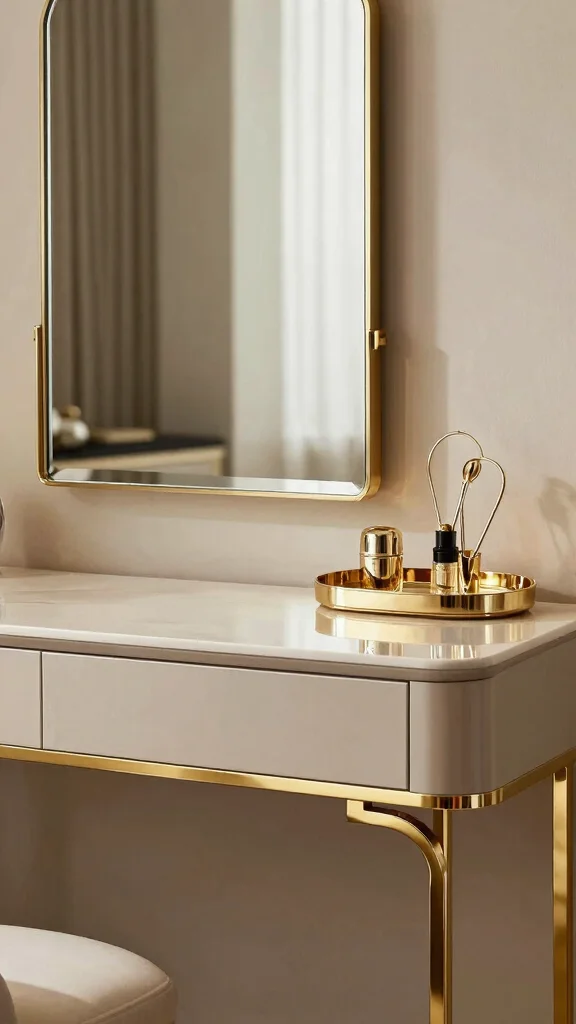 Accessorize with metallic trays or organizers to keep your products tidy while enhancing the overall aesthetic. A bold metallic mirror can serve as a statement piece, contributing to a sophisticated look.