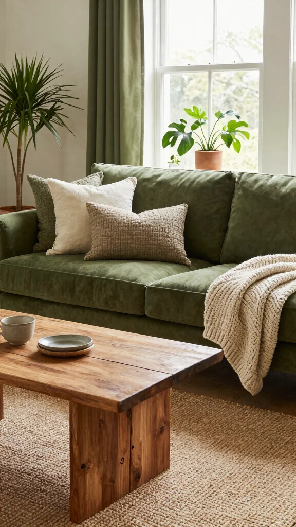 Combining various materials and textures creates a warm, earthy ambiance in your living room. A deep olive green sofa paired with organic cotton, linen, or jute throw pillows establishes a cozy, rustic feel. Adding a chunky knit throw enhances comfort, while a jute or sisal rug grounds the space with natural elements. This mix of textures—smooth cushions against a rough rug—invites visual interest and warmth into the room.