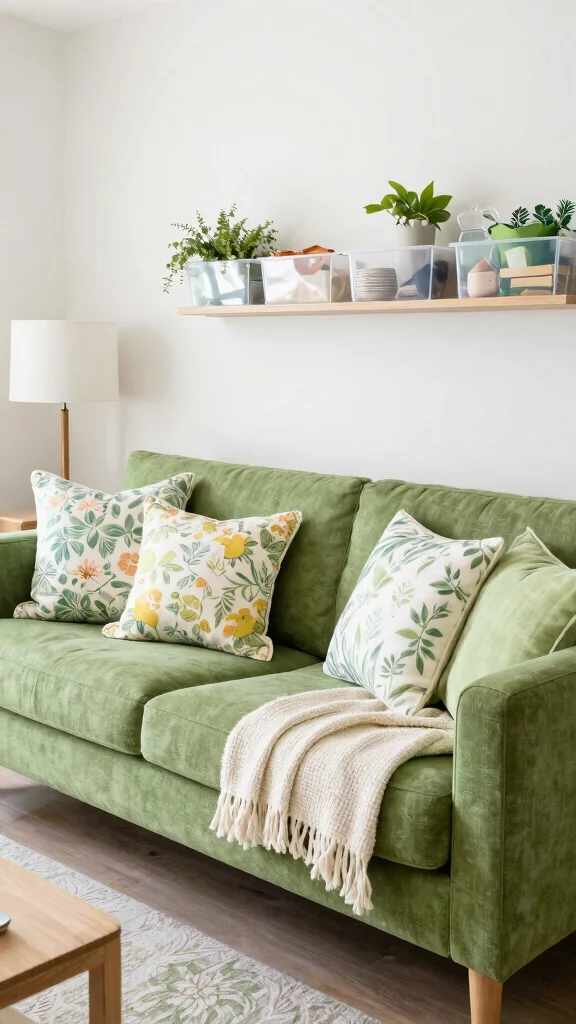 Start with a neutral wall as a backdrop to let the green sofa pop, then pull in vibrant color palettes through cushions, artwork, and a rug. Add a few bold accents—think a mustard throw, navy side chairs, or copper lighting—to create contrast without overwhelming the room. Introduce green furniture accents like leafy plants or a sculptural green lamp to reinforce the theme, and layer textures (linen, velvet, jute) for depth. Finish with a simple, cohesive home decor trends approach that keeps the look fresh and wearable.