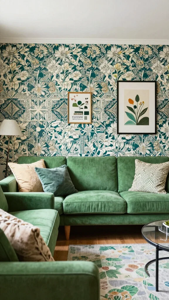 Transform your living room with bold wallpaper that beautifully complements your green sofa. Select an eye-catching floral or geometric pattern that resonates with your personal style. An accent wall behind your sofa can serve as a striking focal point, drawing the eye and creating interest.
