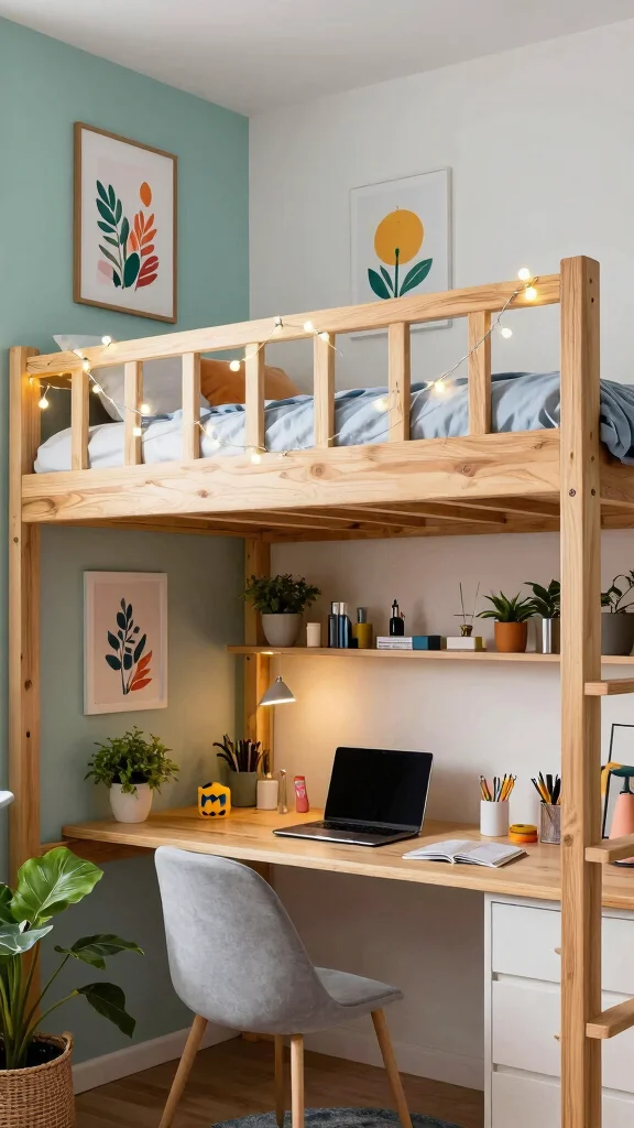 Consider customizing the area below the loft bed to suit your lifestyle. Whether you need a desk for studying or a comfy armchair for relaxation, the possibilities are endless. Adding bright lighting can further enhance the space, making it inviting and vibrant.