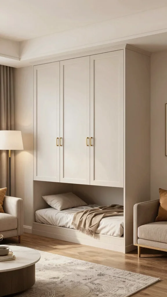Hidden beds in cabinets offer a sophisticated solution that merges style with practicality. These cleverly disguised beds can blend into your existing decor, making them perfect for living rooms or guest rooms. By choosing designs that match your furniture, you can achieve a cohesive look.