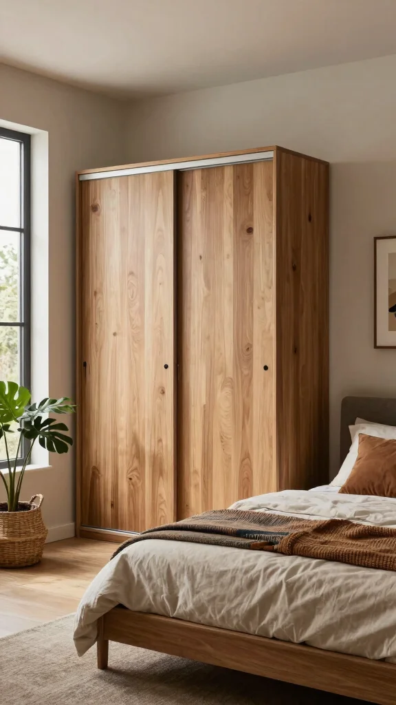 A wood finish sliding wardrobe brings a comforting, organic touch to your bedroom, showcasing the beauty of natural materials.