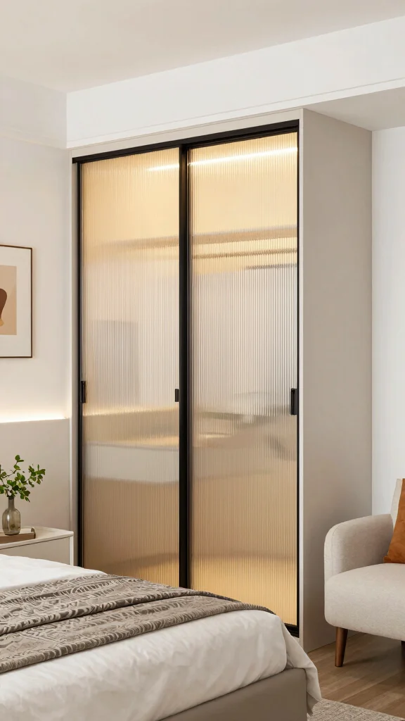 The frosted texture diffuses light beautifully while concealing the contents, achieving a sleek and modern look. This design perfectly balances elegance with functionality, making it a popular solution in contemporary bedrooms.