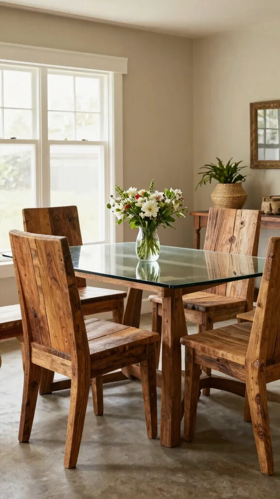 Reclaimed wood dining chairs beautifully combine rustic charm with modern sophistication. Their unique character stems from salvaged wood, making each piece a sustainable choice for your dining space. These chairs not only enhance your decor but also promote eco-friendliness by reducing the need for newly sourced lumber. Picture them paired with sleek glass or metal tables, creating a captivating contrast that draws the eye.