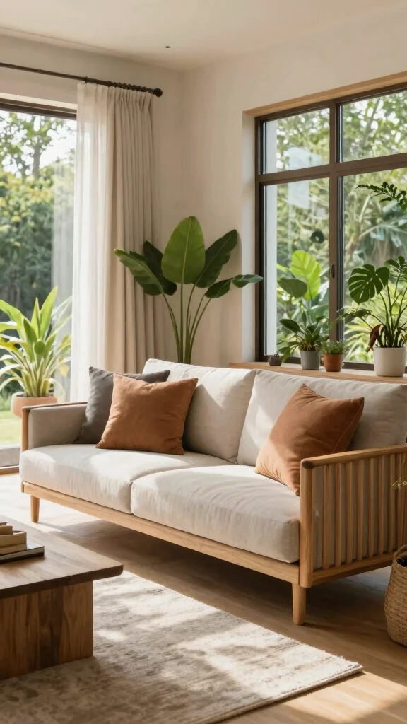 Outdoor-inspired sofas create a fresh, airy atmosphere, seamlessly blending comfort with nature.