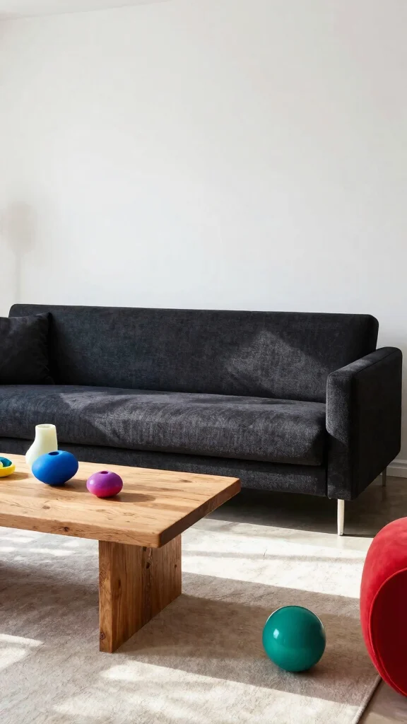 – Pair dark sofas with light, airy decor elements.