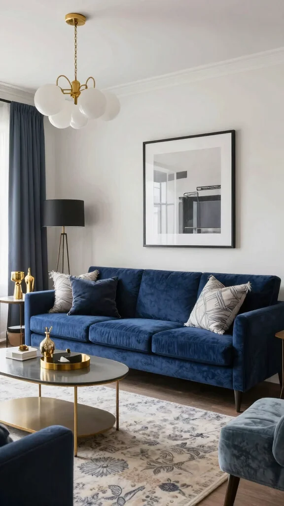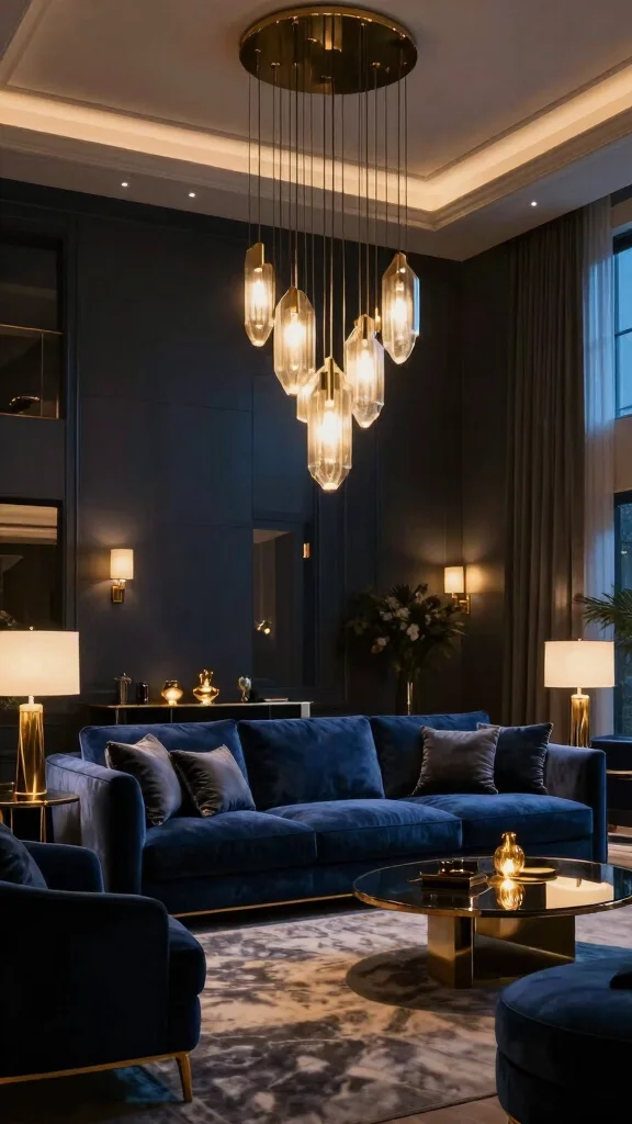 Dramatic lighting sets the mood in your living room, especially with a navy blue sofa. Consider sleek, artistic light fixtures that draw attention and complement the elegance of the navy. A mix of warm and cool lighting creates depth, highlighting key areas in the room. Gold accents can be incorporated through lamps or a striking chandelier, enhancing the luxurious ambiance.