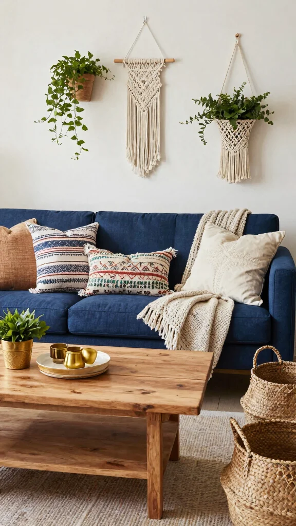 For a bohemian vibe, your navy blue sofa serves as a stunning centerpiece. Embrace the boho chic style by layering various textures and patterns to soften the bold navy. Use colorful throws and eclectic pillows in earthy tones to create a relaxed, inviting atmosphere. Incorporating woven baskets and macramé plant hangers adds depth and character, making the space feel warm and lived-in.