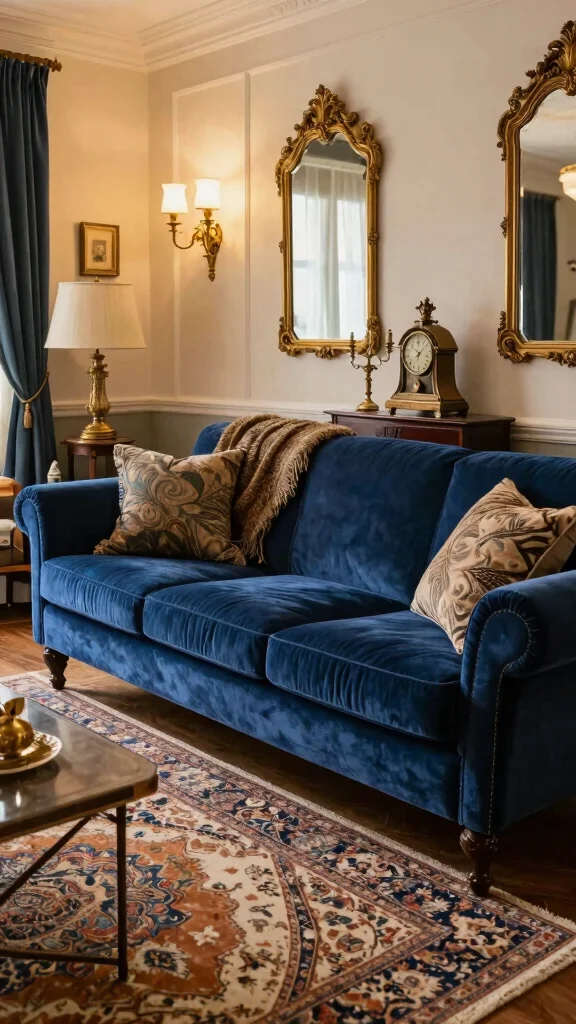 If vintage glam appeals to you, a navy blue sofa perfectly captures this luxurious aesthetic. Pair it with vintage-inspired furniture in dark wood and gold accents for a rich, opulent look. Imagine a lavish area rug with intricate patterns beneath your sofa, tying the entire room together. Rich, textured throws can evoke old Hollywood glamour, enhancing the sofa’s elegance.