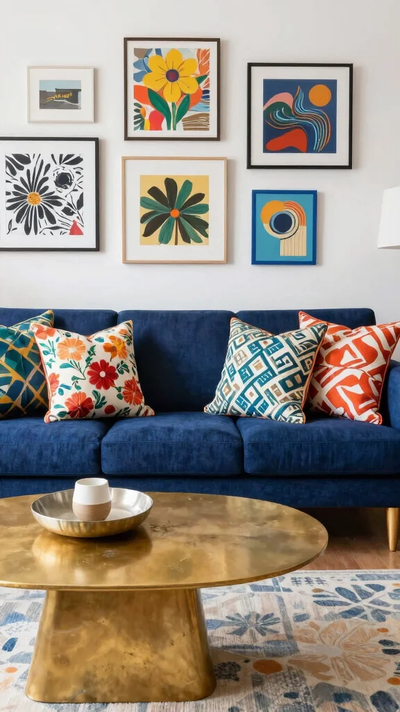 If you have a creative spirit, let your living room reflect that with artistic flair! A navy blue sofa pairs beautifully with abstract artwork that features vibrant colors and bold designs, creating a striking focal point. Hang large abstract pieces above the sofa, using gold frames to elevate the luxurious feel of the space.