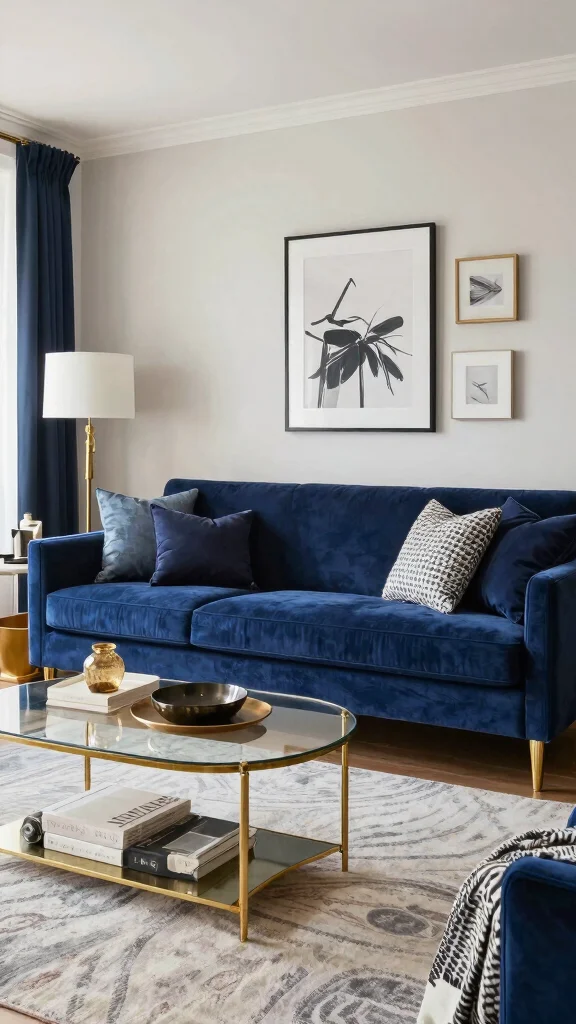 Fun fact: a navy blue sofa living room with gold trims is perceived as 25% more luxurious by guests. Add velvet cushions and a slim gold coffee table to anchor the look—simple, elegant, and instantly polished.