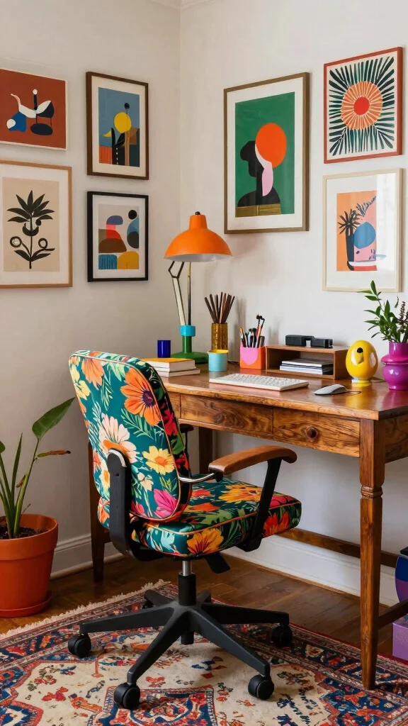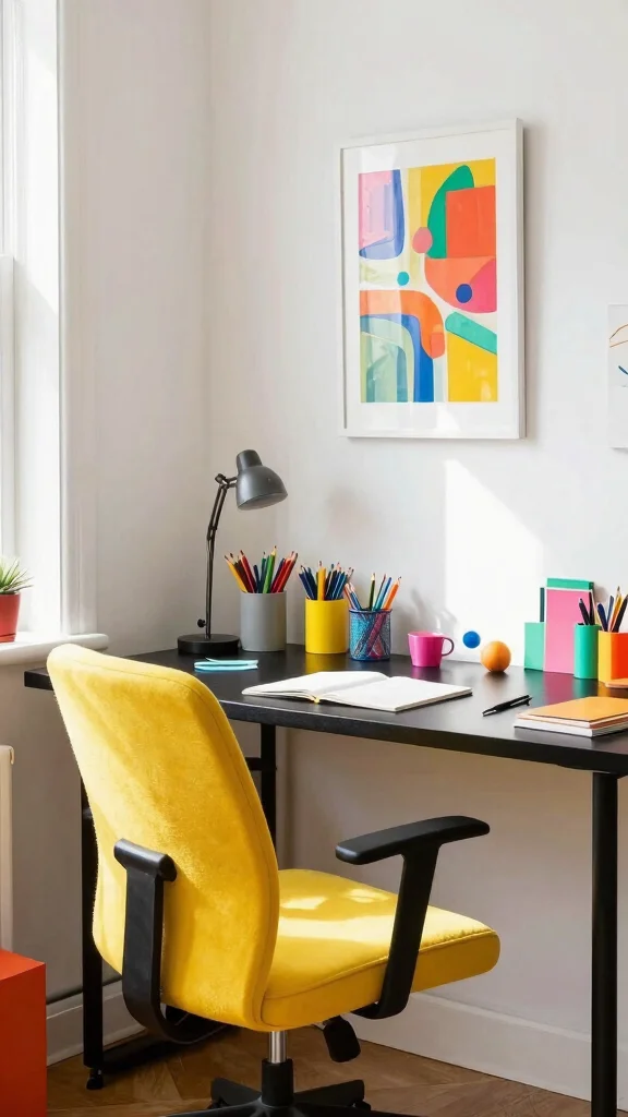 This approach transforms your workspace into a dynamic hub for creativity. The combination of bold colors and playful elements makes your office both functional and fun.