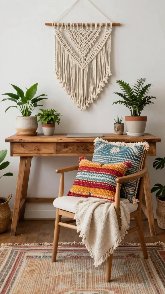 Introduce plants and macramé wall hangings to further enrich the space, transforming your office into a creative sanctuary. This style encourages a relaxed yet productive environment, ideal for those looking to express their individuality.