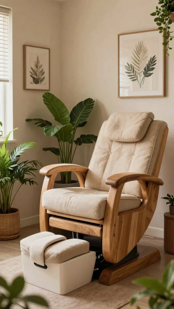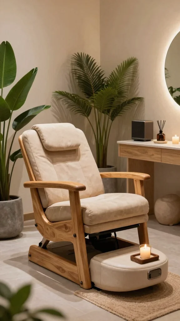 Choose a compact or streamlined pedicure chair with a built-in basin to reduce clutter, and pair it with floating shelves and hidden storage for towels and tools. Use a cohesive color palette and materials that echo your beauty room decor while keeping the home beauty setup serene. Good lighting, a small rug, and wall art can anchor the look without overwhelming the room.