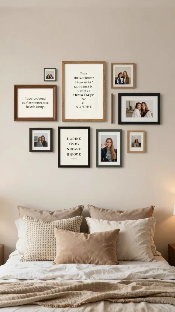 Did you know 78% of people report that daily affirmations boost mood when placed on a wall with photos? Pair quotes with personal photos on your photo frames on the wall bedroom beds for a calmer, more inspired space.