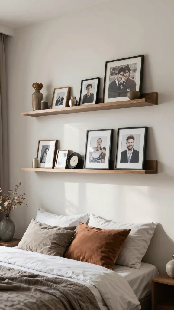 Floating shelves provide excellent platforms for displaying photo frames and allow for flexibility in your decor. This method makes it easy to change up your space or swap photos without needing to commit to a permanent arrangement.