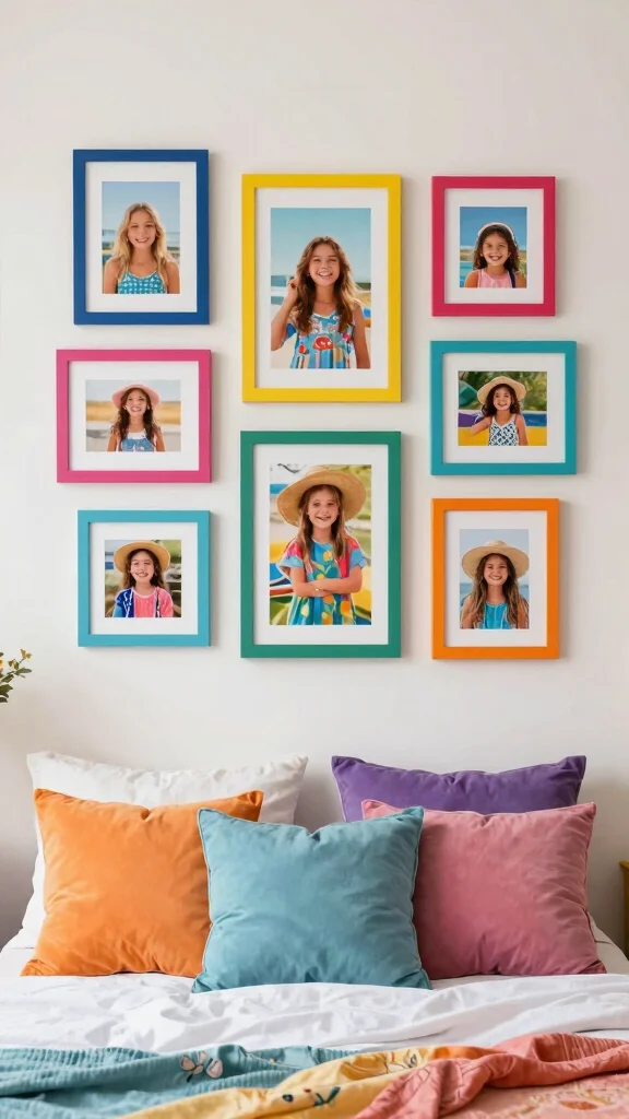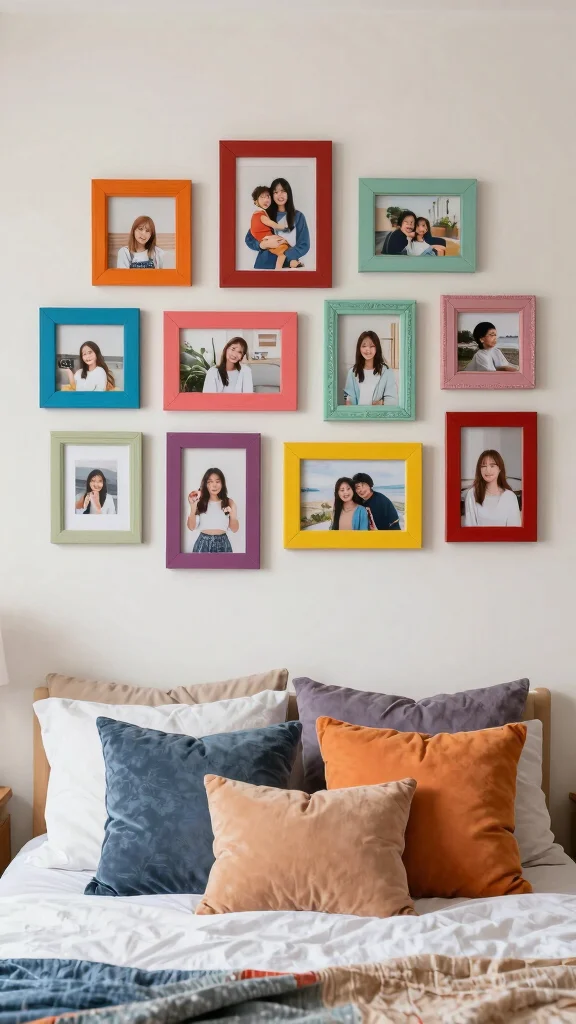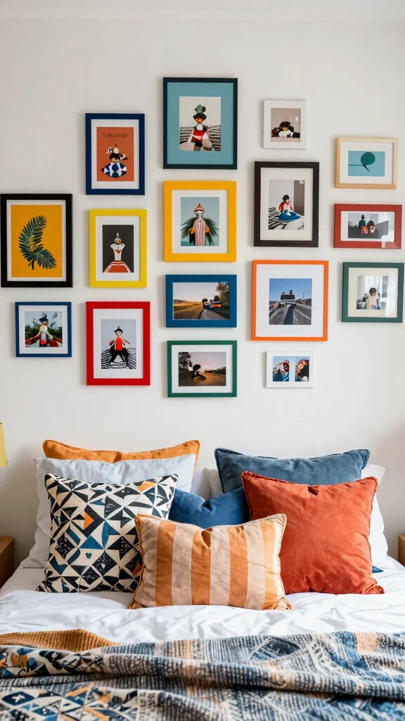 Brightly colored frames can inject a playful burst of personality into your bedroom decor. This approach works especially well in smaller spaces, where a splash of color can bring life without overwhelming the area.