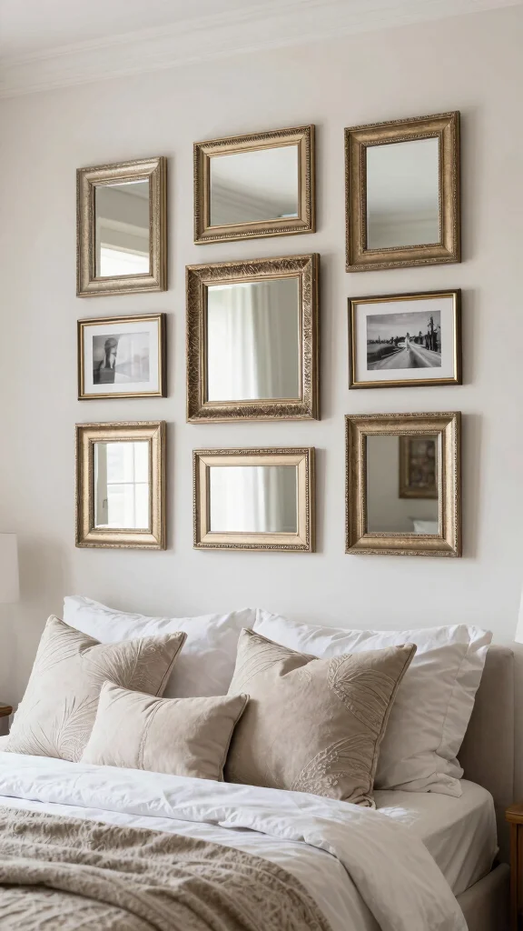 Mirrors serve both decor and functional purposes in your bedroom, adding light and depth to the space. Integrating decorative mirrors into your photo frame arrangement enhances visual appeal and creates an illusion of a larger area.