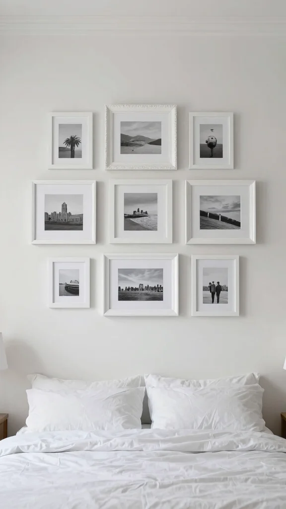 A monochromatic collection of frames can offer a sleek, sophisticated look in your bedroom. By selecting a single color, like crisp white or deep black, and mixing different textures and finishes, you create an elegant uniformity that expands the visual space, making your room feel larger.