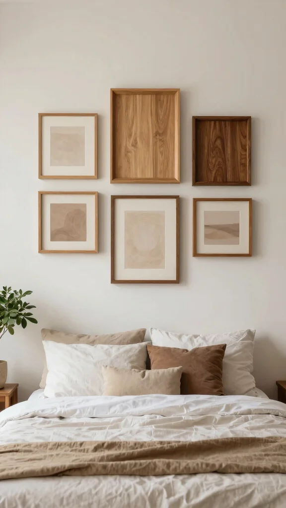 Natural wood frames can infuse your bedroom with warmth and a touch of nature, perfectly complementing soft linens and earthy tones. The organic texture of wood enhances the cozy feel of your space and pairs beautifully with greenery, creating a soothing atmosphere.