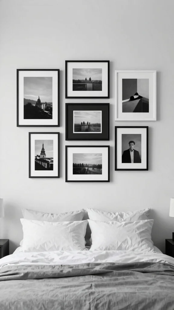 Black and white frames bring timeless elegance that fits seamlessly into any minimalist bedroom. This classic color combination creates a striking visual impact while keeping the overall look simple and clean.