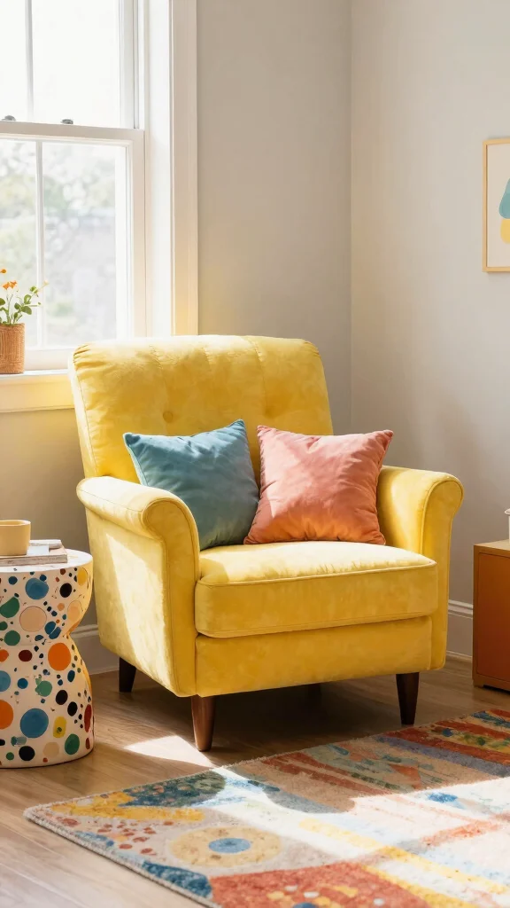 A cheerful reading chair in bedroom immediately lifts the mood—choose sunny colors and let natural light do the rest. Toss in colorful cushions and a whimsical side table, then settle in near a window for a quick, joyful retreat.