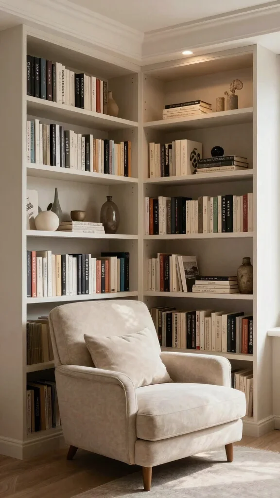 If space allows, consider creating a built-in bookshelf nook around your reading chair. This design not only provides a comfy seat but also integrates storage for your beloved books, creating a dedicated reading space. A custom bookshelf that wraps around your chair can frame it beautifully, enhancing the cozy vibe.