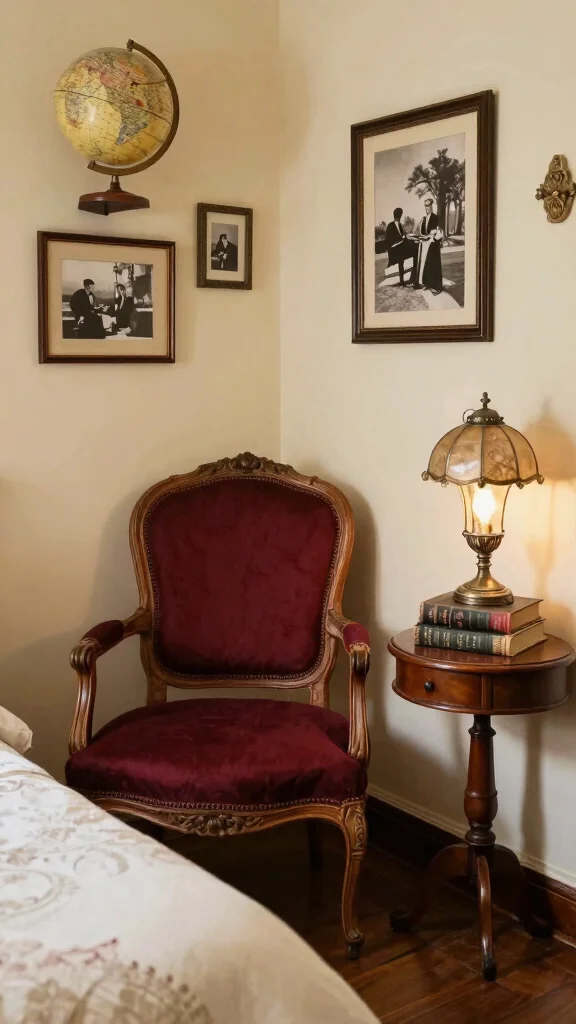 Pair it with an antique side table and whimsical decor like an old globe or a vintage lamp for an inviting atmosphere. This mix of old and new creates a cozy yet stylish reading nook.