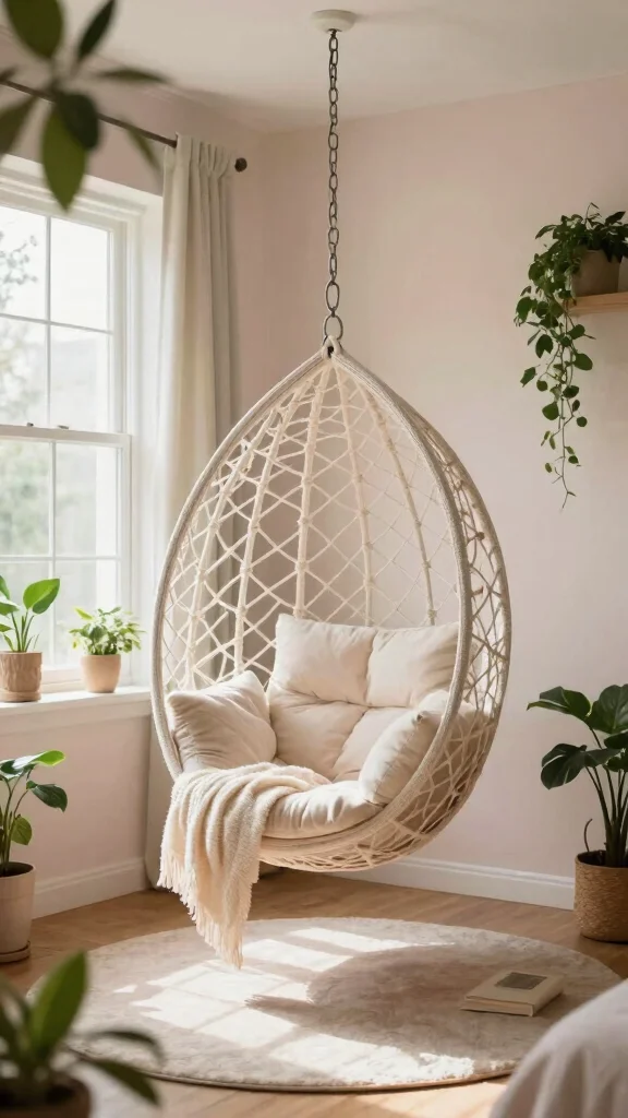 Hanging Chair (30-40″ H) – Best for: Unique space utilization, Minimum space needed: 35 sq ft