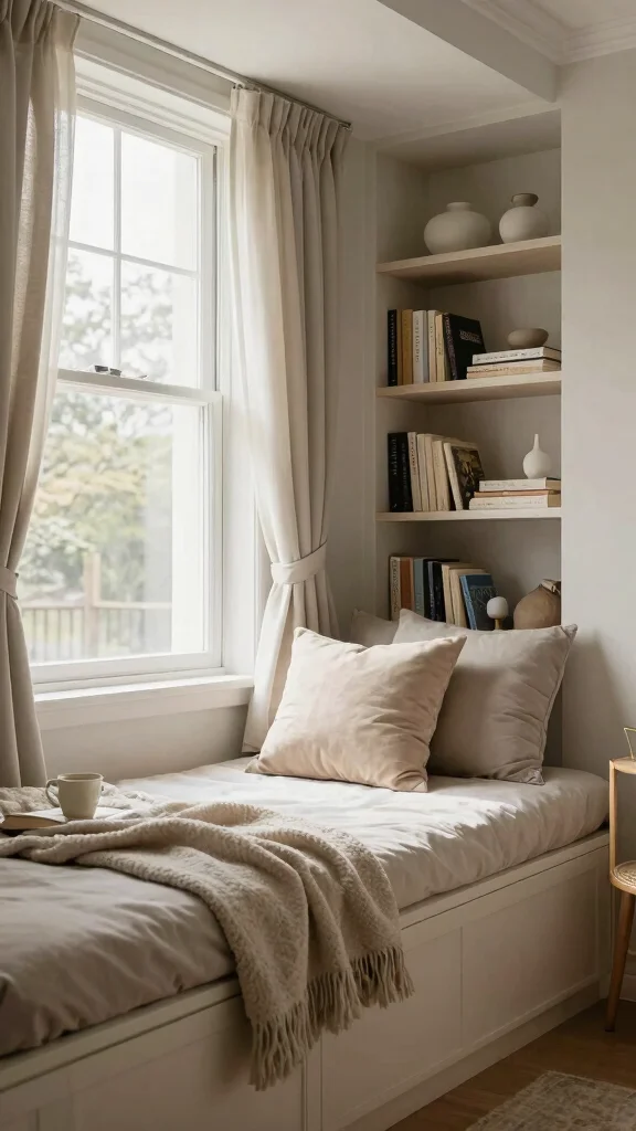 Soft lighting above or within the shelves can add a magical glow, making the area inviting and functional. Don’t forget to include cushions for added comfort, ensuring this nook becomes your favorite spot.