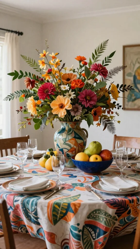 Make a bold statement with eye-catching decor that serves as a focal point at your dining table. Oversized floral arrangements or unique sculptures can spark conversation and capture attention. Choose pieces that reflect your personal style, such as vibrant artwork or woven baskets, to enhance the bohemian theme.