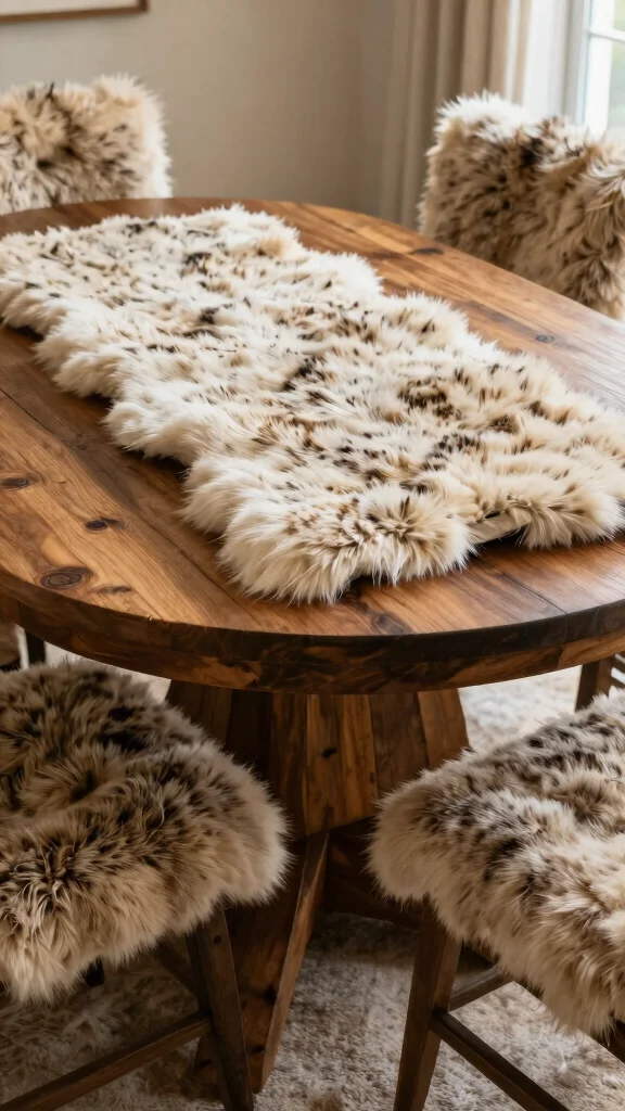 Infuse your dining table with a touch of luxury and comfort through faux fur accents. A soft faux fur table runner or decorative throw adds warmth and invites a cozy feel to family meals. Pairing it with rustic wooden elements creates a lovely balance of textures.
