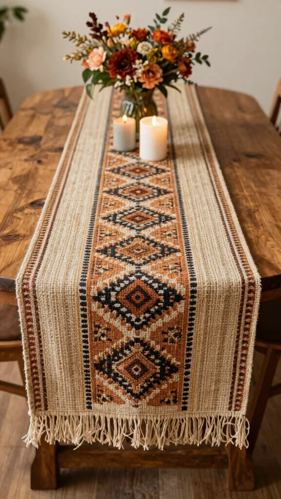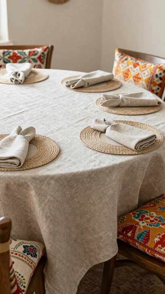 Did you know a table runner can instantly anchor a round dining table decor in under 5 minutes? A bold pattern plus a coordinated palette makes the space feel balanced, bohemian, and ready for family dinners.
