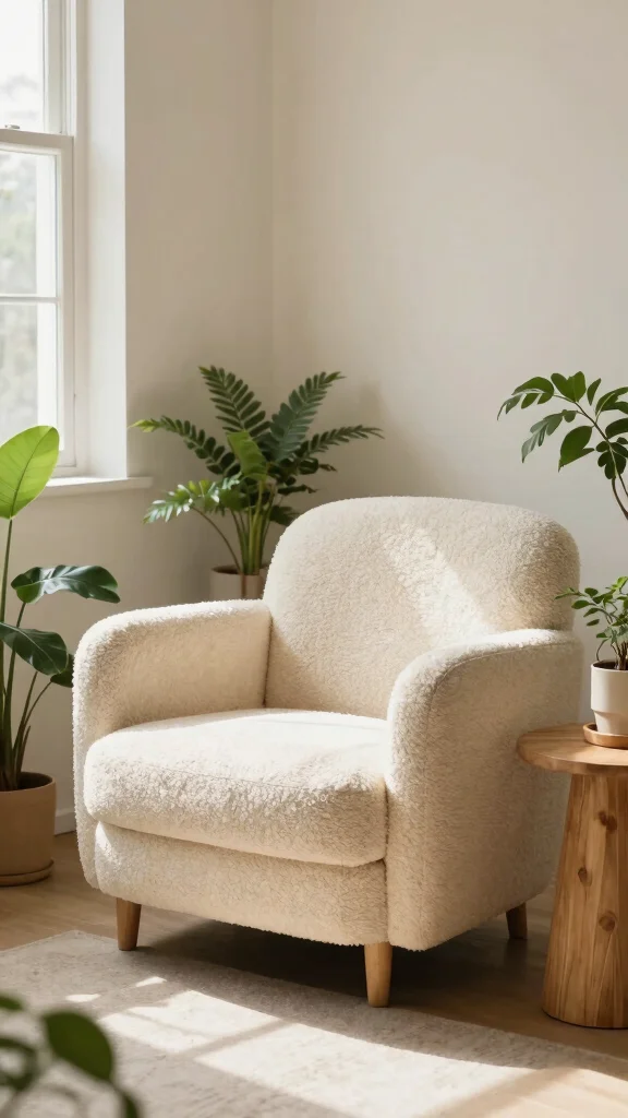 Boucle fabric is a wonderful way to bring warmth and texture into your space. A single chair upholstered in boucle offers a soft, inviting feel while maintaining a chic look. Consider a rounded boucle chair that introduces softness to angular rooms, making it an ideal choice for cozy corners.