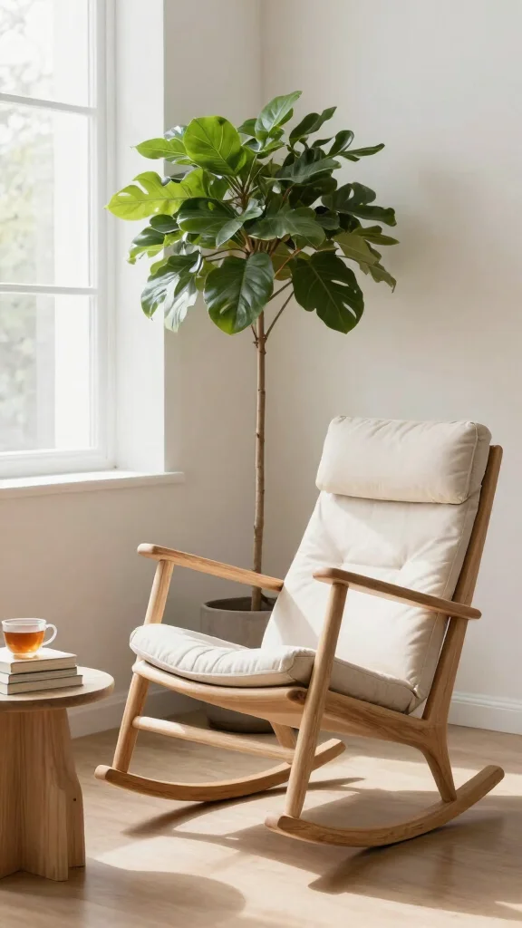 A minimalist rocking chair offers serenity while adding a unique touch to modern decor. With smooth curves and simple lines, these chairs balance playfulness and elegance perfectly. Imagine a light wood rocking chair placed in a neutral-toned room, inviting relaxation and comfort.