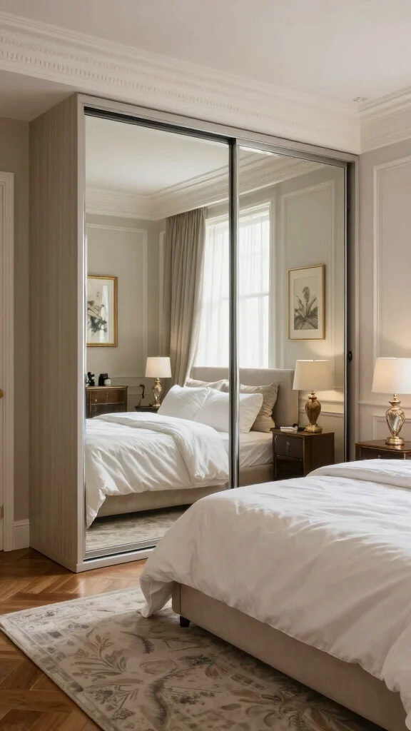 Mirrored sliding doors add a splash of elegance to your bedroom, enhancing both functionality and aesthetics. These doors not only let you check your outfit but also reflect light, creating an illusion of spaciousness, making them ideal for cozy rooms. Pairing these mirrors with soft textiles, such as beige or pastel bedding, can achieve a harmonious balance in your space.