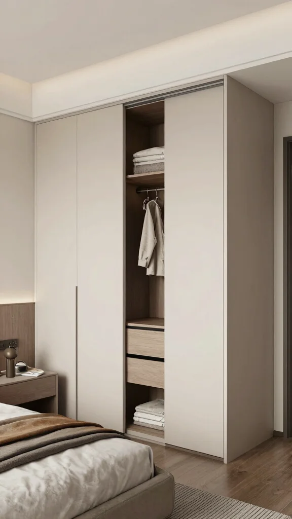 Use bedroom organization ideas like labeled bins, adjustable shelves, and stackable boxes. If possible, go with a continuous track across the ceiling to maximize opening width and reduce clutter visually. Finish with a neutral exterior and a reflective interior to keep the room feeling airy. This approach aligns with interior design trends focused on clean lines and modern wardrobe designs.