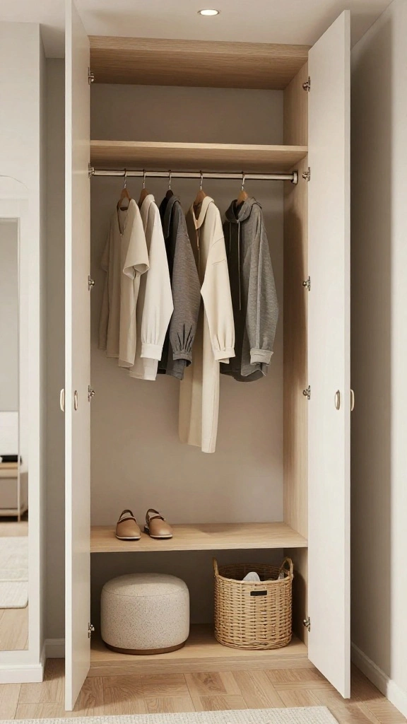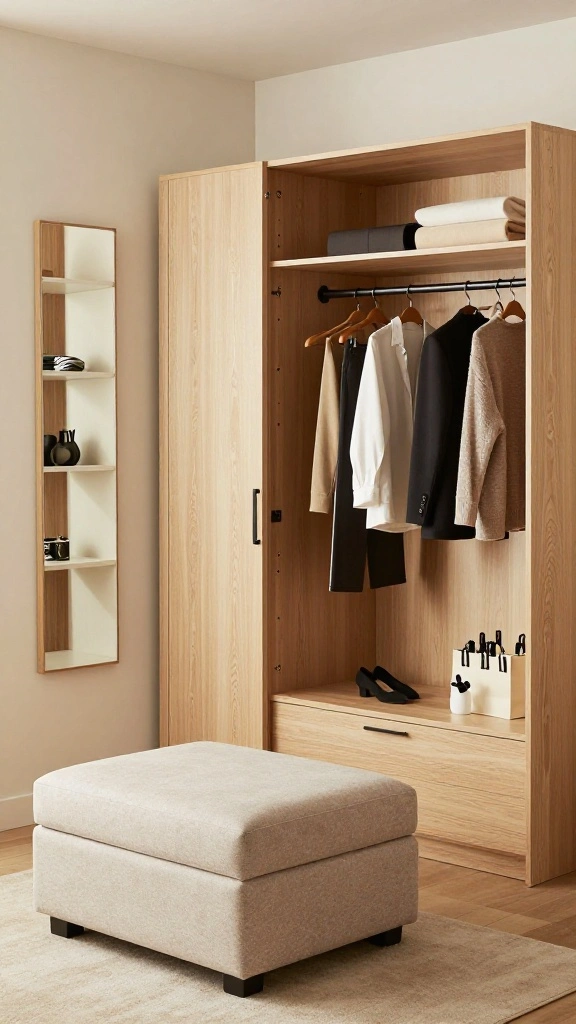 In a compact wardrobe, multi-functional furniture is invaluable. Look for pieces that serve dual purposes, such as a bench with hidden storage or a chic ottoman that holds shoes. These smart choices conserve space while enhancing the overall style of your wardrobe. When selecting furniture, prioritize items that blend seamlessly with your existing decor.